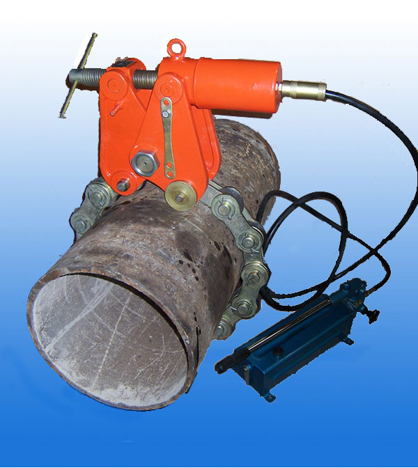 鏈條式液壓擠刀:系天津市自來水公司轉讓專利產品:專利號ZL90203081.7。以手動泵為動力,驅動液壓缸工作,再經過拉緊鏈條刀,使刀輪均勻切入管壁,利用灰鑄鐵的切口效應,使管材斷開,操作簡便生產效率高。
